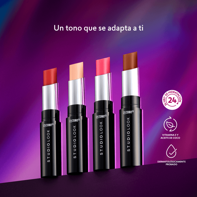 Lip Balm Studio Look con 24 horas de hidratación y un color único. Medidas aproximadas: Alto 88mm; Ancho: 18mm, Fondo: 18mm